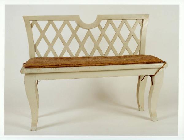Piccola panchetta con schienale a rombi, seduta liscia e gambe arcuate.