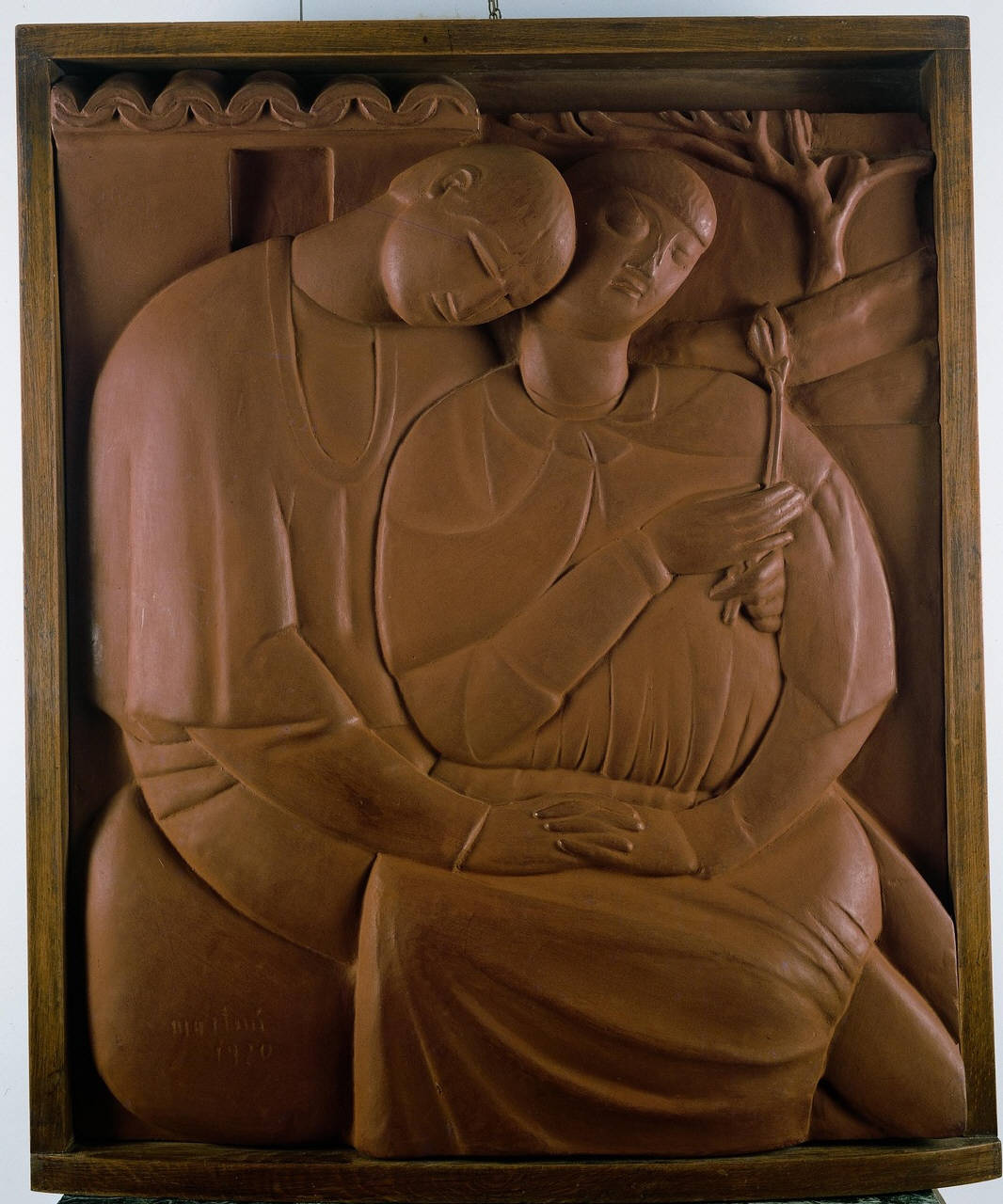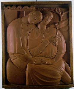 Due amanti nell'atto di abbracciarsi realizzati a bassorilievo in gesso patinato con una tinta rossastra a imitazione della terracotta.