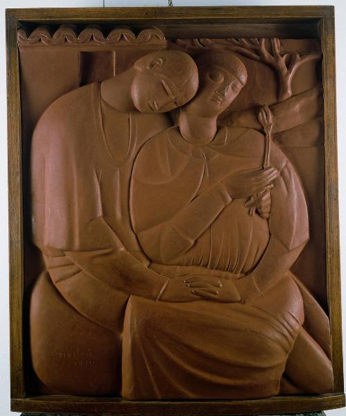 - NOTIZIE STORICO CRITICHE L'opera appena terminata viene inviata in grande fretta alla mostra inaugurale nel marzo del 1920 della Galleria Arte di Milano che vede schierati tutti gli artisti del salotto sarfattiano. Martini si è infatti appena avvicinato a Margherita Sarfatti e agli artisti che lavorano vicino a lei per una maggior chiarezza nelle forme artistiche e un maggior lirismo, espresso in forme pure, geometriche, essenziali, spesso mutuate dai classici, che diventano per loro la strada del cosidetto "ritorno all'ordine" del dopoguerra. Ed è proprio grazie alla Sarfatti che nel 1920 Martini era alloggiato a Rovenna, presso il lago di Como, con Brigida Pessaro e con il pittore Achille Funi, sovvenzionati da Piero Preda poeta e industriale, amico fidato della Sarfatti stessa. L'opera è raccolta e pacata, incentrata sul gesto allo stesso tempo potente e silenzioso dei due amanti, seduti l'una sull'altro e abbracciati arrivano a formare una cerchio quasi perfetto che si pone così al centro della composizione, raccontando il loro amore con una purezza formale assoluta che trova solo analoghi formali in opere coeve quali la "Fanciulla con fiore" di Gino Rossi e il "Tema Mitologico" di Achille Funi. Non è da escludere un riferimento autobiografico al periodo di convivenza e all'imminente matrimonio con Brigida. Dell¿opera esistono tre fusioni postume realizzate nel 1985.