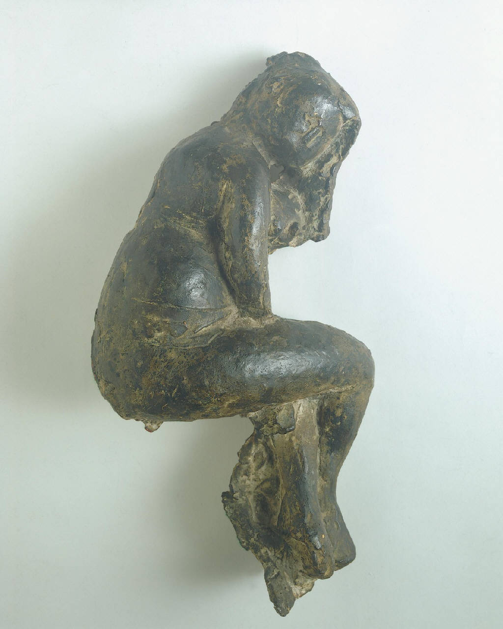 Fusione in bronzo di donna ranicchiata in posizione fetale, la materia risulta emaciata, quasi "violentata".