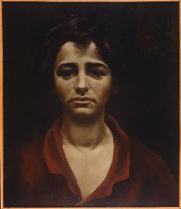Busto di ragazzo su fondo scuro in olio su cartone.