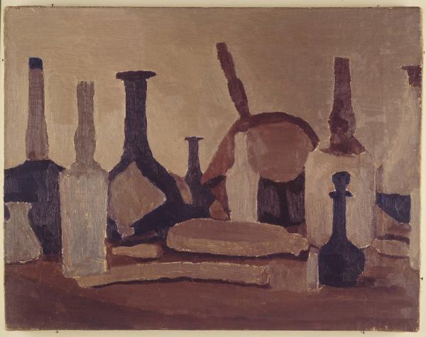 - NOTIZIE STORICO CRITICHE Anche Giorgio Morandi è stato avanguardista, il suo ritorno ai valori primi o primordiali avviene in una cifra altamente moderna. Durante la sua carriera l'artista dipinge più di mille nature morte con "zagagli", i piccoli oggetti quotidiani della casa così definiti in dialetto bolognese. Segue la lezione di Cezanne e torna a dipingere sempre lo stesso soggetto, la novità - cara a qualsiasi artista - non è per lui nel soggetto ma nelle infinite possibilità pittoriche di rappresentarlo. Le due opere donate al FAI da Claudia Gian Ferrari ci raccontano proprio di queste diverse possibilità, come afferma Morandi stesso "mi ci vorrebbero due vite per dipingere a modo le mie bottiglie". La natura morta del 1937 si colloca al termine di un decennio di lavoro iniziato nel 1928-1929: composizione irrequieta, toni terrosi, pennellate ben visibili e contorni aperti. Gli oggetti non lasciano spazi, non descrivono un luogo abitabile ma comunicano nel loro silenzio un inquieto malessere.