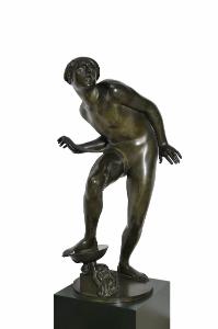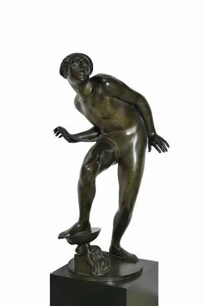 Giovane in posa serpentinata con il piede sinistro su un calice che schiaccia una testa di gorgone in bronzo.