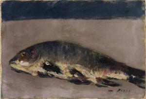 - NOTIZIE STORICO CRITICHE L'opera, donata da Claudia Gian Ferrari al FAI, è datata alla metà del soggiorno parigino del pittore. Durante il soggiorno a Parigi, de Pisis affianca alle vedute della città una produzione di nature morte, tema caro al gruppo degli "Italiens de Paris" (Tozzi, Campigli, de Chirico, Savinio, Paresce). Il pesce diventa un pretesto per concentrarsi sull'atto della pittura: la pennellata manifesta il pensiero dell'artista, la composizione complessa,\n sé un'atmosfera sospesa. Il sottotitolo indicato in alcune occasioni, "Omaggio a Courbet", porta a confrontare l'opera di de Pisis con "La trota" di Gustave Courbet, esempio del realismo dell'artista che dedica la stessa attenzione agli uomini come alle bestie.