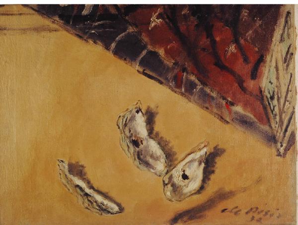 - NOTIZIE STORICO CRITICHE L'opera, donata da Claudia Gian Ferrari al FAI, è datata alla metà del soggiorno parigino del pittore. Durante il soggiorno a Parigi, de Pisis affianca alle vedute della città una produzione di nature morte, tema caro al gruppo degli "Italiens de Paris" (Tozzi, Campigli, de Chirico, Savinio, Paresce). Quanto rappresentato diventa un pretesto per concentrarsi sull'atto della pittura: la pennellata manifesta il pensiero dell'artista, la composizione complessa, come in questo caso, porta con sé un'atmosfera sospesa. In quest'opera giocano suggestioni molto diverse tra loro: se la tela alla destra di scorcio fa pensare alla collocazione della scena nello studio dell'artista, le tre ostriche su un piano ocra e il punto di vista quasi zenitale fanno pensare a prima vista a un'esterno, forse una marina. Le ostriche, presenti spesso nell'opera dell'artista ("Plage aux ecrevisses et aux coquillages", "Le ostriche"...) sono oggetti quasi sensuali nella molteplicità complessa delle loro forme ulteriormente sottolineata dalla loro solitudine.