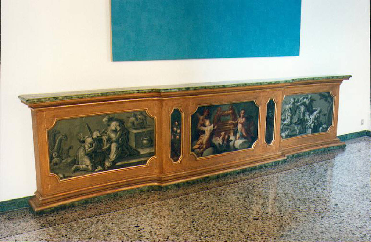La balaustrata, in legno intagliato dipinto, è opera di una manifattura i\ntaliana ed è databile alla metà del XVIII secolo. Il fronte della balaus\ntra presenta cinque specchiature: le due laterali sono dipinte a monocromo, le tre centrali invece sono a colori.