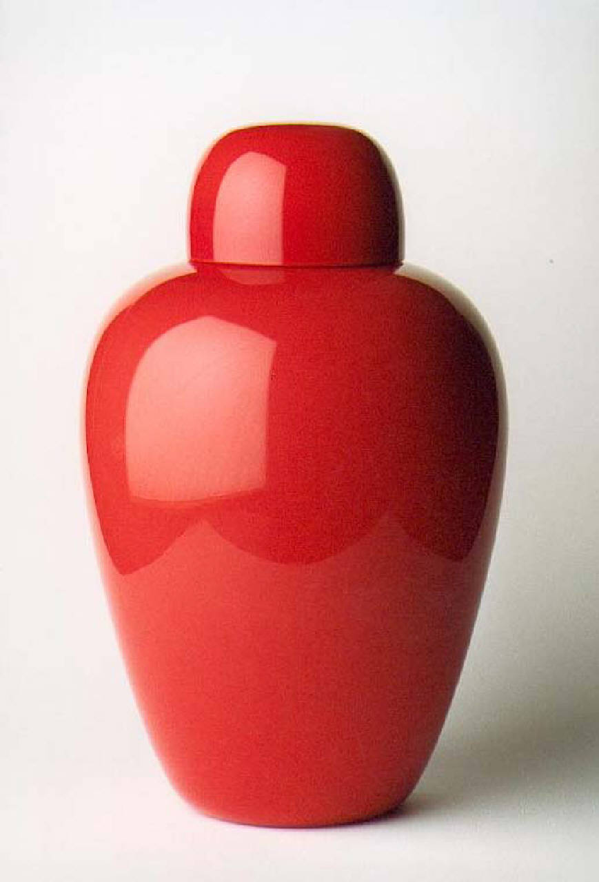 Vaso con coperchio in vetro opalino incamiciato colore corallo. Realizzato dalla vetreria Venini di Murano, è uno dei modelli di vasi in vetro opac\no soffiato e lavorati a mano della serie ¿Cinesi¿ ideata da Carlo Scar\npa. Le forme e il materiale opaco riecheggiano il vasellame cinese.