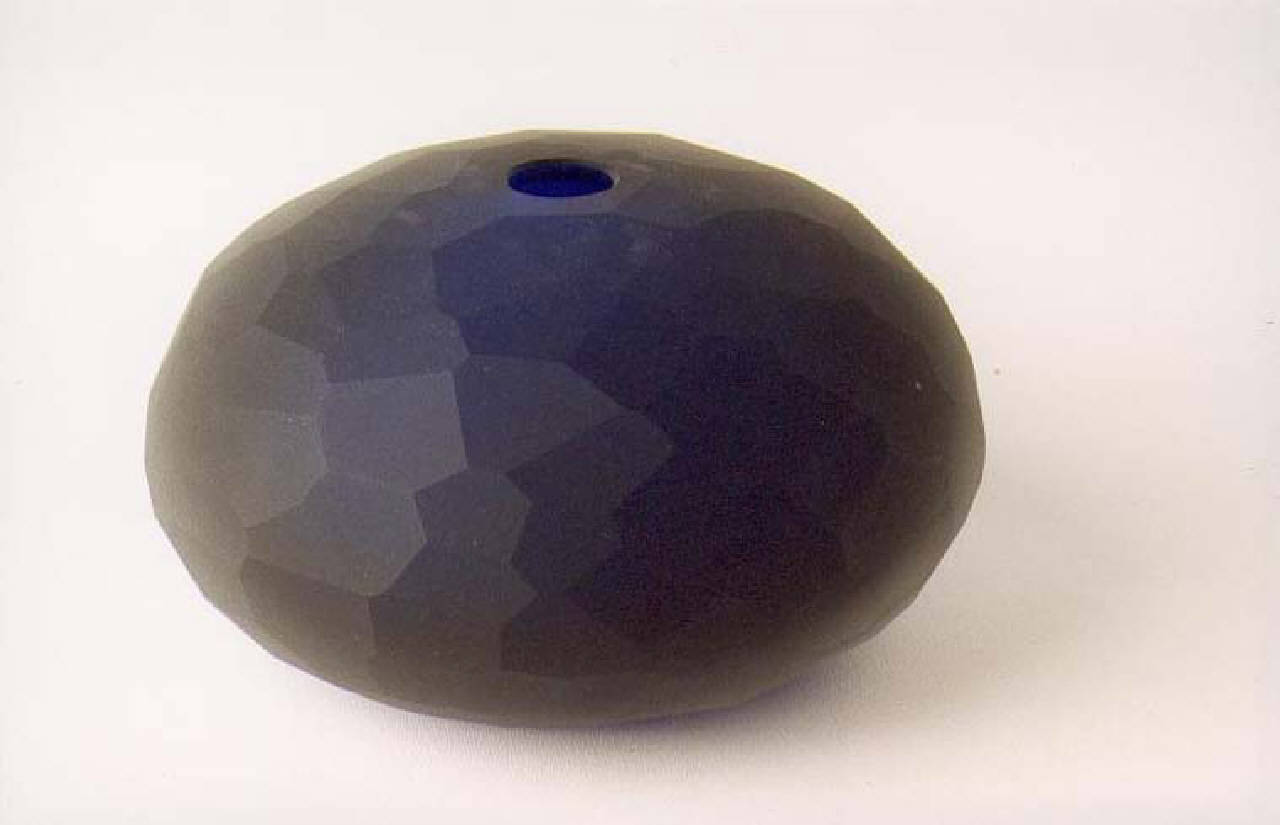 Vaso in vetro molato a varie sfaccettature color zaffiro. Realizzato dalla vetreria Venini di Murano, è uno dei modelli di vasi in vetro opaco soff\niato e lavorati a mano della serie ¿Ruvidi¿ disegnata da Rodolfo Dordo\nni.