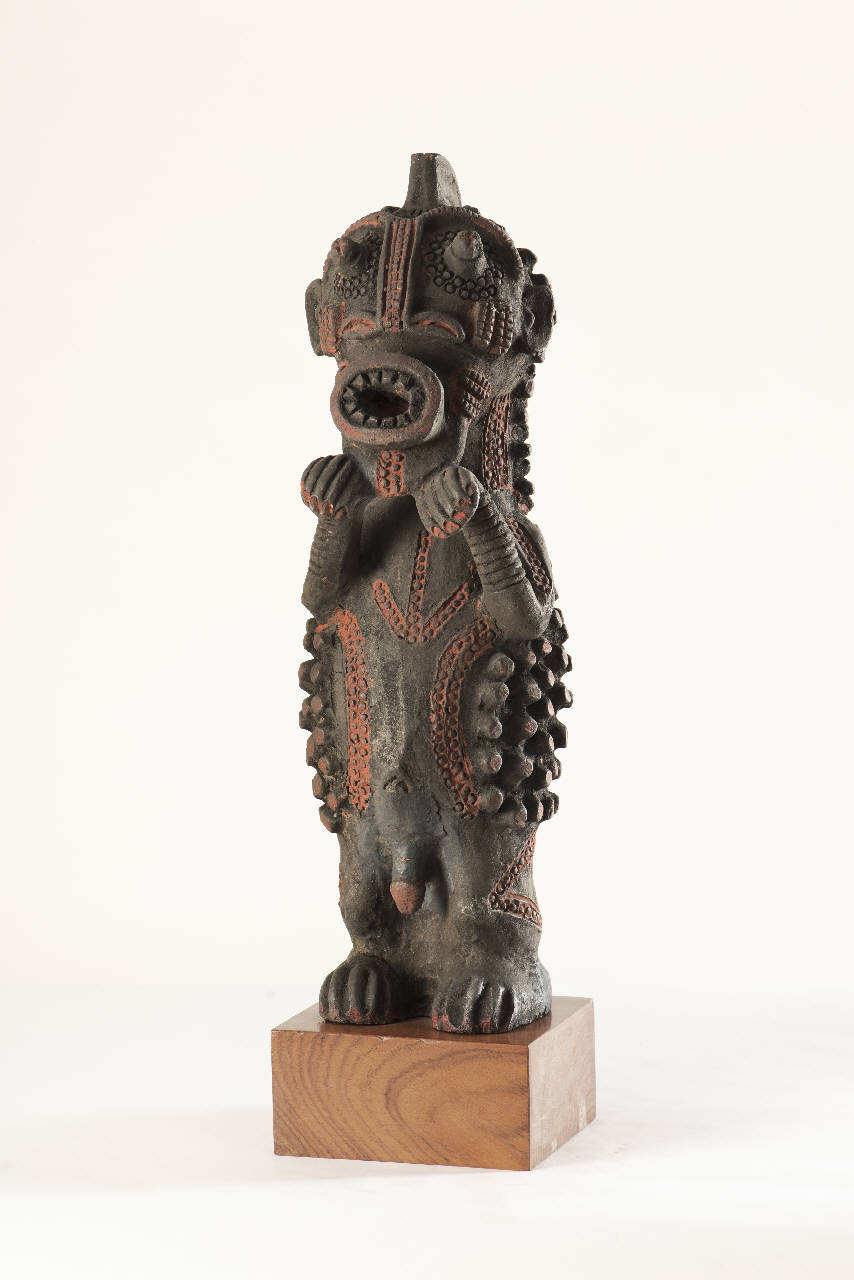 - NOTIZIE STORICO CRITICHE Primitivo Mambila, confine Camerun-Nigeria. Si veda l'expertise di Franco Monti allegato alla documentazione fotografica. Figura maschile. Protuberanze tronco coniche con sommità di colore rosso lungo i fianchi e sulla sc\nhiena. Queste potrebbero rappresentare scarificazioni così come la doppia\n linea di chiodi evidenziata in colore rosso che scende dall¿arcata sopr\nacciliare lungo il collo, le braccia e il busto, come anche la linea a freccia che scende lungo il centro del torace prolungando quella che parte dal naso e prosegue sul mento. La curvatura del ventre, leggermente prominente, è controbilanciata da quella della schiena. Pene in evidenza con glan\nde tinto in rosso. Il volto presenta occhi conici con pupilla cruciforme, amplificati da due cerchi concentrici di scarificazioni posti alla base; naso scarificato con larghe narici ad arco di cerchio.; bocca spalancata, aggettante, di forma ellissoidale, con dentatura che ne segue il contorno. Dalla sommità della testa pare una cresta saggitale la cui linea in ril\nevo prosegue lungo lungo la schiena sul quale è presente un rilievo circo\nlare forato destinato probabilmente a ospitare una sostanza che attivava la figura in un contesto rituale o terapeutico. Sulle braccia incisioni che rimandano a bracciali; le mani poste sotto il mento mostrano il dorso e unghie colorate di rosso. Arti inferiori breviformi con scarificazioni a freccia sulle ginocchia ginocchia e grandi pedi con dita evidenziate da incisioni. I Mambila sono una popolazione di circa cinquantamila persone stanziate sugli altopiani fra Nigeria e Camerun (divisione conseguente alla spartizione coloniale anglo-tedesca). Vivono prevalentemente di agricoltura (mais, sorgo, manioca, ignami, arachidi) ma anche allevamento a partire dagli anni ¿30 e caffè dagli anni ¿50, coltura per l¿esportazione che \nha portato a una monetizzazione dell¿economia e alla deforestazione dell\na regione. Mentre in altre parti d¿Africa la terracotta è lavoro esclus\nivamente femminile, fra i Mambila, almeno in linea di principio, poteva essere svolto sia da uomini che da donne (Gosselain 2000). Poco si sa sull?\n?uso di questi oggetti anche se si pensa possano essere stati usati per proteggersi dai furti o in riti di circoncisioni e di guarigione. I due orifizi posti sul fianco destro e sulla schiena di questa figura lasciano supporre che fossero destinati a ospitare una sostanza che attivava la figura in un contesto rituale o terapeutico. Pare però che possano avere anche \nla funzione opposta: quella di privare la figura del suo potere per poterne prendere possesso. Gebauer nel 1961 riferiva di statuine in terracotta (mantab) usate come guardiani dei boschetti di palme da vino: si riteneva che avrebbero reso i ladri. impotenti Le statue potevano essere sepolte con i loro proprietari oppure il loro potere trasferito ad altre persone attraverso rituali appropriati. (Ivan Bargna)