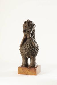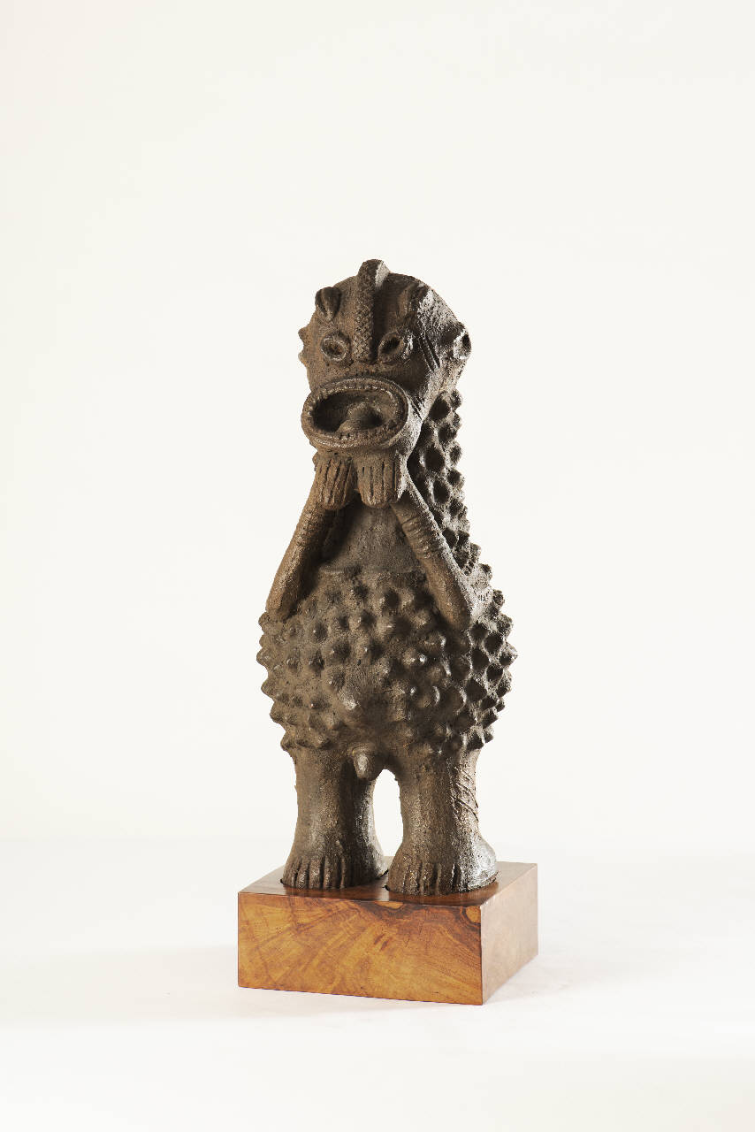 - NOTIZIE STORICO CRITICHE Primitivo Mambila, confine Camerun-Nigeria. Si veda l'expertise di Franco Monti allegato alla documentazione fotografica. Figura maschile (pene in evidenza) in posizione eretta, ricoperta sia nella parte anteriore che posteriore da protuberanze che potrebbero richiamare le scarificazioni cheloidali che le donne portavano sul ventre. Lunghe braccia inanellate (incisioni) con mani affiancate, poste sotto il mento. Gambe breviformi con superficie incisa (tre linee oblique) e grandi piedi conici e dita marcate da incisioni parallele. Grande bocca spalancata con lingua in mostra. Occhi ellissoidali concavi (la cui forma è ripresa nelle orecchie). La testa è per\ncorsa da una cresta saggitale ai cui lati sono poste due protuberanze a forma di chicco di caffè; incisioni parallele sulla nuca a indicare i capel\nli. I Mambila sono una popolazione di circa cinquantamila persone stanziate sugli altopiani fra Nigeria e Camerun (divisione conseguente alla spartizione coloniale anglo-tedesca). Vivono prevalentemente di agricoltura (mais, sorgo, manioca, ignami, arachidi) ma anche allevamento a partire dagli anni ¿30 e caffè dagli anni ¿50, coltura per l¿esportazione che ha \nportato a una monetizzazione dell¿economia e alla deforestazione della r\negione. Mentre in altre parti d¿Africa la terracotta è lavoro esclusiva\nmente femminile, fra i Mambila, almeno in linea di principio, poteva essere svolto sia da uomini che da donne (Gosselain 2000). Poco si sa sull¿us\no di questi oggetti anche se si pensa possano essere stati usati per proteggersi dai furti o in riti di circoncisioni e di guarigione. I due orifizi posti sul fianco destro e sulla schiena di questa figura lasciano supporre che fossero destinati a ospitare una sostanza che attivava la figura in un contesto rituale o terapeutico. Pare però che possano avere anche la \nfunzione opposta: quella di privare la figura del suo potere per poterne prendere possesso. Gebauer nel 1961 riferiva di statuine in terracotta (mantab) usate come guardiani dei boschetti di palme da vino: si riteneva che avrebbero reso i ladri. impotenti Le statue potevano essere sepolte con i loro proprietari oppure il loro potere trasferito ad altre persone attraverso rituali appropriati. (Ivan Bargna)