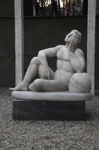 Nudo maschile seduto e appoggiato ad un masso in marmo.