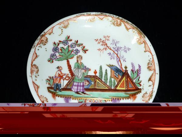 Piattino in porcellana policroma decorato con 'chinoiseries'.