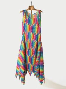 Abito di Issey Mayake composto da tre pezzi. Disegno a fantasia composto da matite colorate. Tessuto plissettato.\nCapo appartenuto a Claudia Gian Ferrari.