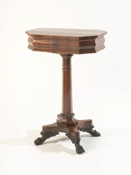 Tavolo da lavoro impiallacciato in piuma di mogano. Piano ottagono incernierato; all'interno scomparti vari; sostegno sfaccettato e piedi leonini.