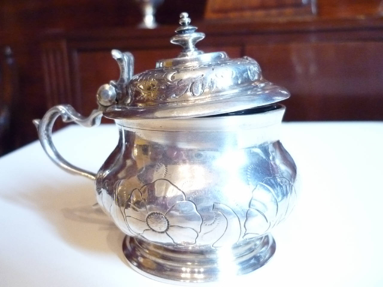 Coppia di contenitori in argento per spezie; interno in vetro blu.