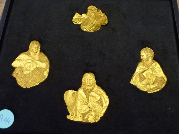 Quattro rilievi in oro provenienti da una croce astile raffiguranti: Padre Eterno, Madonna, San Giovanni Evangelista e San Matteo. Sono inseriti in un cofanetto in velluto nero.