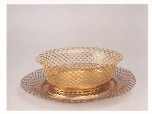 Coppia di cestini rotondi leggermente svasati con piede e relativi sottopiatti in argento dorato caratterizzati da una lavorazione a traforo.