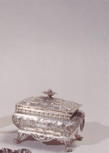 Cofanetto mistilineo con due maniglioni ad anello poggiante su quattro piedini; il coperchio a incastro culmina con un piccolo pomolo.