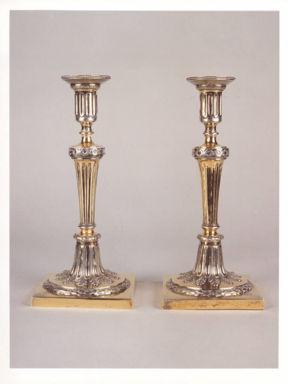 Coppia di candelieri con fusto a balaustro. Il piede tondo poggia su una base quadrata.