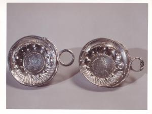 Tastevin costituito da una piccola coppa circolare variamente baccellata recante al centro la riproduzione di una medaglia. Impugnatura ad anello.