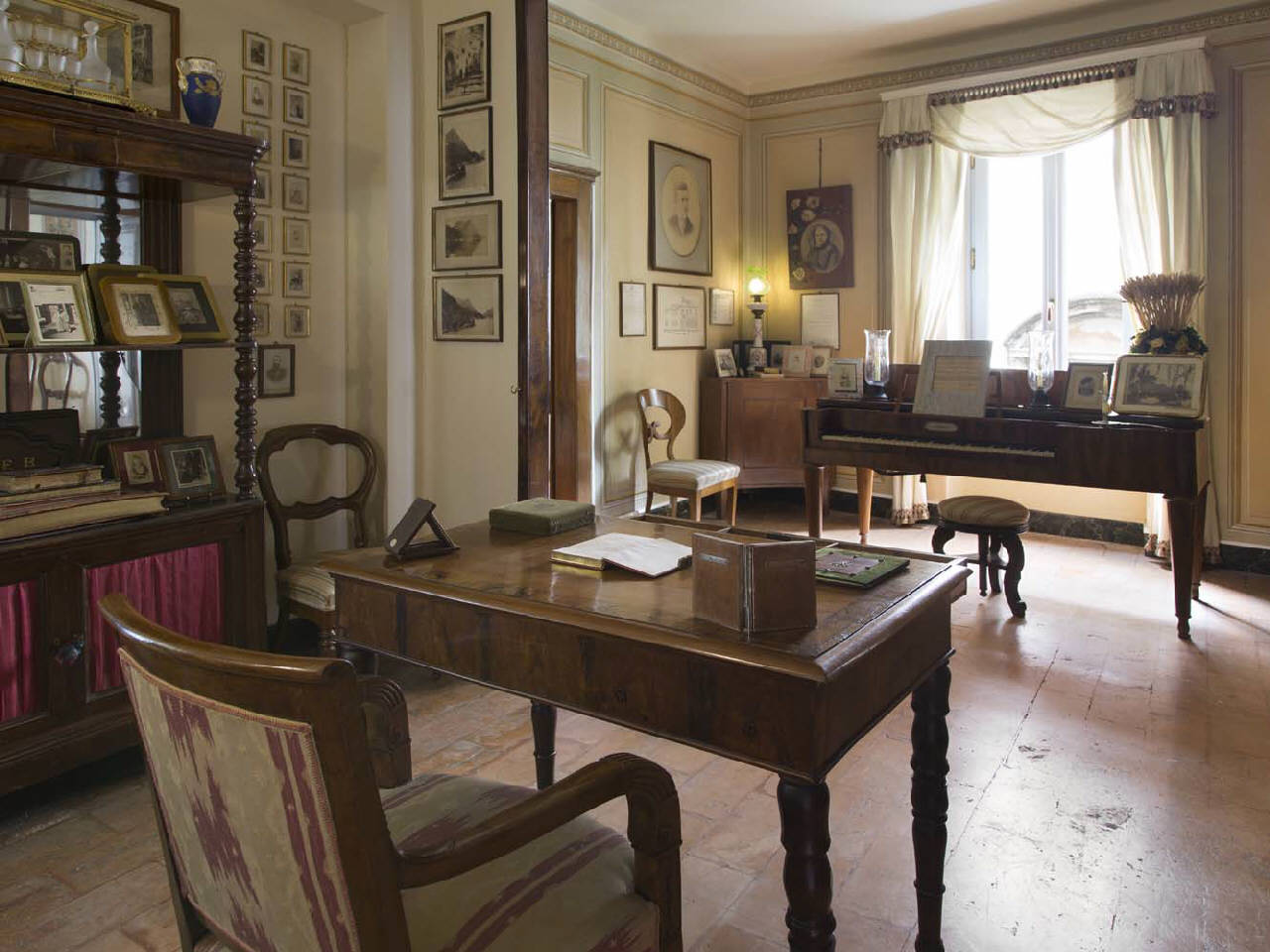Lo scrittoio in legno, databile al XIX secolo, era la scrivania di Antonio Fogazzaro; lo testimoniano le numerose iscrizioni manoscritte all'interno del cassetto, che documentano gli episodi salienti della vita dello scrittore.