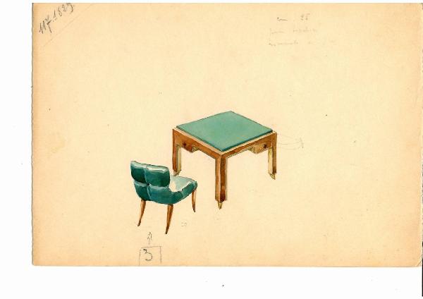 - NOTIZIE STORICO CRITICHE Allievo del pittore Achille Funi a Brera e poi dell¿architetto Piero Por\ntaluppi, Guglielmo Ulrich diventa presto un importante architetto e designer. Dieci disegni e cinque fotografie storiche sono stati donati in ricordo di Luca Scacchetti, allievo di Ulrich e amico di famiglia, al FAI da Giancorrado e Giacinta Ulrich. I disegni, risalenti al 1935, e già in origin\ne inventariati nell'archivio dell'architetto, erano utilizzati per mostrare ai clienti la resa finale del pezzo progettato, in questo caso arredi per le sale della villa, tra cui tavolini, sedie, poltrone, tavoli da muro e divani, soprattutto per la veranda e il salone. In particolare in questo disegno è possibile vedere una sedia scamosciata verde e un tavolo da gio\nco in legno di mogano con piano di velluto verde e gambe rivestite in lamina di bronzo. Il tavolo è corredato da un piccolo cassetto per lato per l\ne fiche, il cui meccanismo è suggerito dal presente disegno. Progettato p\ner la Biblioteca, il tavolo venne realizzato in tre esemplari: due ancora presenti nella Biblioteca e uno collocato nel seminterrato.