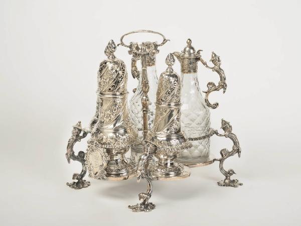 Portampolle in argento con quattropiedi terminanti a foglia con testa orientale nella parte superiore, contenente due ampolle in cristallo e argento e tre flaconi spargipolvere in argento con finale a forma di pigna.