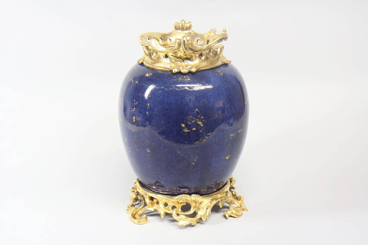 Vaso ovoidale in porcellana di Cina blu poudrè con tracce del decoro originale in oro, montature francesi Luigi XV alla base e al collo in bronzo cesellato e dorato a motivi rocailles traforati.