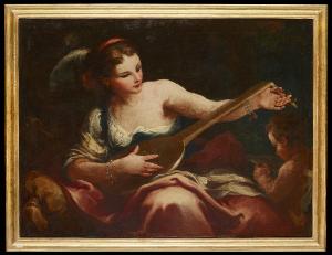- NOTIZIE STORICO CRITICHE I quattro dipinti, pubblicati per la prima volta nel 1982 nell¿impresa e\nditoriale delle ¿Collezioni private bergamasche¿, con un¿attribuzion\ne oscillante tra Francesco Capella (1714-1784) e Mauro Picenardi (1735-1809), nel 1989 sono stati assegnati a Picenardi da Licia Carubelli. Nato a Crema nel 1735 da una famiglia di origine cremonese, Mauro Picenardi era figlio d¿arte: il padre Tomaso, un pittore la cui produzione è ancora ogg\ni sfuggente, si occupò della sua prima formazione artistica e di quella d\nel fratello Giovanni Battista. Tra il 1758 e il 1759 si allontanò da Crem\na, per tornarvi sporadicamente negli anni successivi. La ragione di questo allontanamento potrebbe essere un alunnato presso il veronese Giambettino Cignaroli (1706-1770), riferito dalla letteratura artistica (già in A. P\nasta, "Le pitture notabili di Bergamo che sono esposte alla vista del pubblico", Bergamo 1775, p. 83), ma non documentato da fonti archivistiche. Conferme del legame di Picenardi con questo artista sono fornite dalle sue opere giovanili, che richiamano le soluzioni e il linguaggio di Cignaroli, ma anche da un invito a Verona nel 1769 per essere acclamato accademico d? ??onore. Tornato a Crema intorno al 1770, nel 1782 si trasferì definitiva\nmente a Bergamo, dove si affermò e rimase fino alla morte (1809). Qui tro\nvò committenti non solo nei circoli della chiesa locale, ma anche tra pri\nvati; tra questi, il conte e collezionista Giacomo Carrara (1714-1796). Per tutta la sua vita Picenardi lavorò tra la bergamasca e la madrepatria; \nle sue opere dialogano strettamente con il Settecento veneto, veronese e bergamasco, per avvicinarsi solo in una fase finale alle novità neoclassic\nhe. Riconoscibile per la grande vivacità cromatica e le mature pennellate\n sfrangiate, fu influenzato non solo da Giambettino Cignaroli, ma anche da Andrea Celesti (1637-1712) e Sebastiano Ricci (1659-1734). Il gruppo di dipinti conservato nella Sala della Gerusalemme Liberata di Palazzo Moroni è uniforme per soluzione compositiva e tessuto coloristico. La composizio\nne prevede in tutti i casi una figura femminile, in forte contrasto chiaroscurale con lo sfondo, accompagnata da un putto; le cromie sono gialle, verdi e rosa, intrise di luce. La Poesia è una giovane donna che si appoggi\na con eleganza su un cuscino; sopra di esso ha appoggiato un quaderno, su cui sta per scrivere. Un putto alato, raffigurato a sinistra, le offre un libro. Anche la Musica è seduta su un cuscino; sta suonando un liuto, men\ntre un putto, appena visibile nella penombra, legge uno spartito. Raffinata e sensuale è la Geometria, che segue il movimento del compasso sul glob\no terrestre; dietro di lei, un putto regge i suoi strumenti di lavoro. Chiude la serie di allegorie la Scultura, raffigurata quasi di spalle, con scalpello e martello; qui il putto è divenuto una piccola scultura in marmo\n, che la donna sta modellando. Gli incarnati delle figure femminili sono luminosi, morbidi e lisci; osservandoli si ha l¿impressione che siano qua\nsi di porcellana. Le quattro opere, ora allestite nell'antica sala da ballo dell'abitazione, erano state collocate originariamente nella Sala dell'Età dell'Oro, dove fungevano da sovrapporta. E' probabile che da qui siano\n state spostate in seguito ai lavori di rifacimento e riallestimento dell'edificio, nel quarto decennio del XIX secolo.