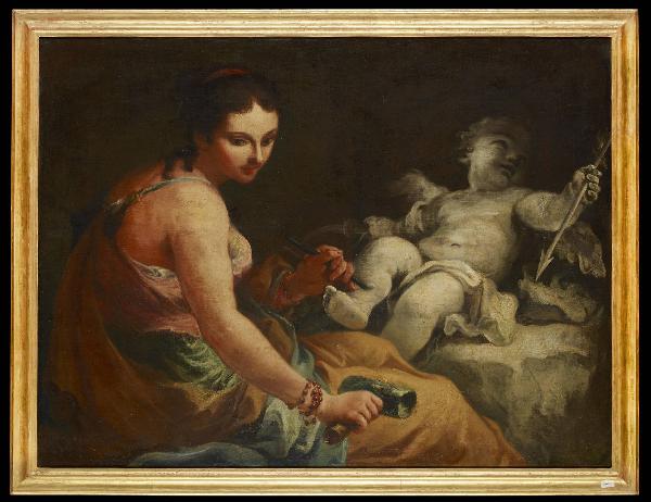 - NOTIZIE STORICO CRITICHE I quattro dipinti, pubblicati per la prima volta nel 1982 nell¿impresa e\nditoriale delle ¿Collezioni private bergamasche¿, con un¿attribuzion\ne oscillante tra Francesco Capella (1714-1784) e Mauro Picenardi (1735-1809), nel 1989 sono stati assegnati a Picenardi da Licia Carubelli. Nato a Crema nel 1735 da una famiglia di origine cremonese, Mauro Picenardi era figlio d¿arte: il padre Tomaso, un pittore la cui produzione è ancora ogg\ni sfuggente, si occupò della sua prima formazione artistica e di quella d\nel fratello Giovanni Battista. Tra il 1758 e il 1759 si allontanò da Crem\na, per tornarvi sporadicamente negli anni successivi. La ragione di questo allontanamento potrebbe essere un alunnato presso il veronese Giambettino Cignaroli (1706-1770), riferito dalla letteratura artistica (già in A. P\nasta, "Le pitture notabili di Bergamo che sono esposte alla vista del pubblico", Bergamo 1775, p. 83), ma non documentato da fonti archivistiche. Conferme del legame di Picenardi con questo artista sono fornite dalle sue opere giovanili, che richiamano le soluzioni e il linguaggio di Cignaroli, ma anche da un invito a Verona nel 1769 per essere acclamato accademico d? ??onore. Tornato a Crema intorno al 1770, nel 1782 si trasferì definitiva\nmente a Bergamo, dove si affermò e rimase fino alla morte (1809). Qui tro\nvò committenti non solo nei circoli della chiesa locale, ma anche tra pri\nvati; tra questi, il conte e collezionista Giacomo Carrara (1714-1796). Per tutta la sua vita Picenardi lavorò tra la bergamasca e la madrepatria; \nle sue opere dialogano strettamente con il Settecento veneto, veronese e bergamasco, per avvicinarsi solo in una fase finale alle novità neoclassic\nhe. Riconoscibile per la grande vivacità cromatica e le mature pennellate\n sfrangiate, fu influenzato non solo da Giambettino Cignaroli, ma anche da Andrea Celesti (1637-1712) e Sebastiano Ricci (1659-1734). Il gruppo di dipinti conservato nella Sala della Gerusalemme Liberata di Palazzo Moroni è uniforme per soluzione compositiva e tessuto coloristico. La composizio\nne prevede in tutti i casi una figura femminile, in forte contrasto chiaroscurale con lo sfondo, accompagnata da un putto; le cromie sono gialle, verdi e rosa, intrise di luce. La Poesia è una giovane donna che si appoggi\na con eleganza su un cuscino; sopra di esso ha appoggiato un quaderno, su cui sta per scrivere. Un putto alato, raffigurato a sinistra, le offre un libro. Anche la Musica è seduta su un cuscino; sta suonando un liuto, men\ntre un putto, appena visibile nella penombra, legge uno spartito. Raffinata e sensuale è la Geometria, che segue il movimento del compasso sul glob\no terrestre; dietro di lei, un putto regge i suoi strumenti di lavoro. Chiude la serie di allegorie la Scultura, raffigurata quasi di spalle, con scalpello e martello; qui il putto è divenuto una piccola scultura in marmo\n, che la donna sta modellando. Gli incarnati delle figure femminili sono luminosi, morbidi e lisci; osservandoli si ha l¿impressione che siano qua\nsi di porcellana. Le quattro opere, ora allestite nell'antica sala da ballo dell'abitazione, erano state collocate originariamente nella Sala dell'Età dell'Oro, dove fungevano da sovrapporta. E' probabile che da qui siano\n state spostate in seguito ai lavori di rifacimento e riallestimento dell'edificio, nel quarto decennio del XIX secolo.