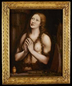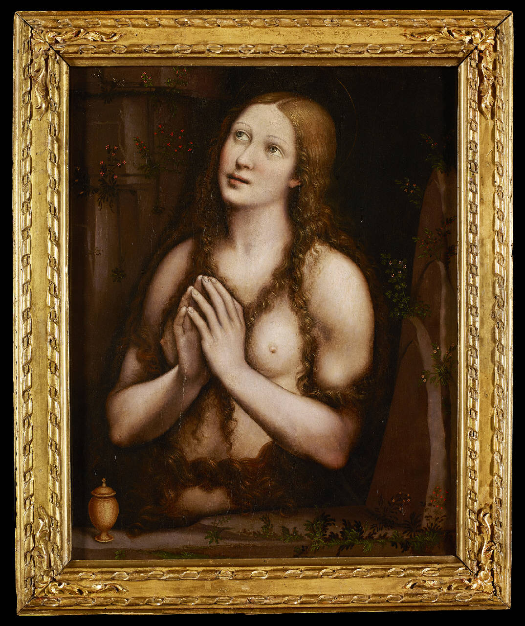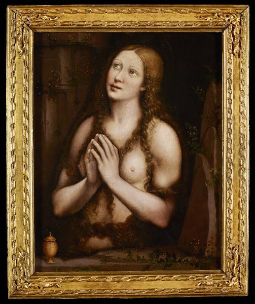 - NOTIZIE STORICO CRITICHE Accanto a Santa Caterina d¿Alessandria, Maria Maddalena costituisce uno \ndei soggetti iconografici più frequentati da Giovan Pietro Rizzoli, detto\n Giampietrino, e senza dubbio uno dei più rappresentativi della sua produ\nzione. Si deve infatti proprio a questo artista, allievo di Leonardo a Milano, l¿invenzione di un nuovo filone iconografico, apprezzatissimo dalla\n committenza privata: quello delle sante raffigurate in chiave sensuale-religiosa. Se le prime soluzioni dell¿artista sono più velate e influenza\nte dal linguaggio leonardesco, con il passare del tempo le mani e i capelli delle sante accentuano la valenza erotica del dipinto, mentre l¿influe\nnza di Leonardo si affievolisce per lasciare spazio a rappresentazioni sempre più convenzionali e appesantite. Queste opere ebbero enorme successo,\n come testimonia l¿esistenza di numerose repliche e varianti della stess\na invenzione, prodotte dalla bottega dell¿artista oppure da suoi seguaci\n e imitatori. Tra le Maddalene più fortunate, compare anche quella che pr\necede questo dipinto, da cui sono state tratte più versioni. La santa è \nraffigurata nuda, a mezzo busto, in preghiera; i suoi capelli, intrecciati all¿altezza dell¿ombelico a formare una sensualissima cintura, si dis\ntribuiscono dando risalto ai seni e alle braccia. L¿ambientazione in un \npaesaggio roccioso, a cui ¿ probabilmente in un secondo momento ¿ sono\n stati aggiunti dei piccoli fiori, allude con tutta probabilità alla grot\nta di Sainte-Baume, in Provenza, dove secondo la ¿Legenda aurea¿ di Ja\ncopo da Varazze la Maddalena avrebbe trascorso gli ultimi anni della sua vita da eremita. In primo piano, sulla sinistra, è raffigurato il tradizio\nnale attributo della santa: il vasetto di alabastro, utilizzato per ungere i piedi di Cristo durante la cena presso Simone il Fariseo. Le evidenti cadute di stile sono dovute in parte a ridipinture successive, in parte alla mano di collaboratori dell¿artista. Di questa immagine, come già anti\ncipato, esistono numerose versioni: sicuramente autografe sono le Maddalene oggi conservate all¿Hermitage di San Pietroburgo (inv. ??-10279), ai\n Musei Civici di Pavia (inv. P 121 b), al Museo di Capodimonte e allo Staatliche Museen di Berlino, ma anche nella collezione Solbiati di Busto Arsizio e in una raccolta privata fiorentina. Altre due versioni sono state registrate in due collezioni romane: nel 1920 presso i Bonacossi e prima del 1968 nella collezione Sestieri. Altrettanto fortunata è una seconda vers\nione del medesimo soggetto, nella quale la Maddalena ha le braccia incrociate sul petto: tra gli esemplari più significativi di questa invenzione, \nsi ricordano i dipinti conservati alla Pinacoteca di Brera (già a Milano,\n raccolta cardinal Monti), in una collezione privata padovana (già a Mila\nno, collezione Stadion) e nella cattedrale di Burgos.