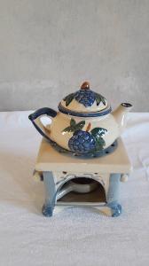 Veilleuse in porcellana dipinta a mano con motivi decorativi vegetali a rilievo e policromi (grappoli d'uva); profili blu per gli orli. Composta da quattro elementi: fusto quadrato con apertura per il godet su una delle facce; godet (piccolo recipiente atto a contenere l'olio e il lucignolo) posto all'interno del fusto; teiera con manico e piccolo beccuccio; coperchio con presa a pomolo.