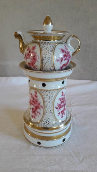 Veilleuse in porcellana dipinta a mano con decorazione floreale color rosa entro medaglioni lineari ovali dorati; decorazioni a cerchiolini in oro; profilature dorate per gli orli e i vari componenti. Composta da tre parti: base ad anello rastremata verso l'alto con fori per areazione; fusto a sezione circolare rastremato verso l'alto con fori per areazione, orlo superiore espanso; teiera di forma panciuta con invaso, orlo superiore espanso, manico a orecchio, beccuccio mosso; coperchio con presa a punta.