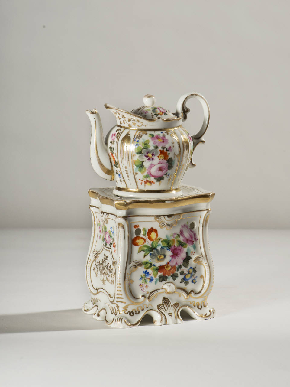 Veilleuse in porcellana dipinta a mano riccamente decorata con raffigurazioni di motivi floreali policromi raggruppati in mazzi, profilature dorate per gli orli e i singoli componenti; elementi decorativi a rilievo sottolineati dalle dorature. La veilleuse dalle forme mosse di gusto barocco si compone di tre elementi: fusto rettangolare con fori superiori per areazione, apertura per il godet; teiera panciuta con invaso, manico ad orecchio e beccuccio mosso; coperchio con presa a pomolo.