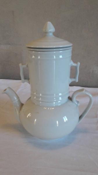 Veilleuse in porcellana bianca priva di decorazioni, composta da quattro elementi: teiera con manico ad orecchio, beccuccio mosso; fusto superiore con due manici; filtro interno, coperchio con presa a pomolo.