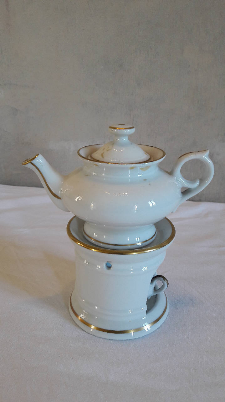 Veilleuse composta da quattro pezzi: fusto a sezione circolare con fori per areazione nella parte superiore e apertura per il godet nella parte inferiore, orlo inferiore rastremato verso l'alto e orlo superiore espanso; godet all'interno del fusto; teiera di forma panciuta e schiacciata con invaso, orlo superiore espanso, manico a orecchio con bitorzolo, beccuccio mosso; coperchio con presa circolare. A fondo bianco, presenta linee dorate sull'orlo inferiore e superiore del fusto, sull'orlo superiore e inferiore della teiera, sul beccuccio e sul manico, sulla presa del coperchio e lungo il bordo inferiore. Si tratta di un rifacimento novecentesco con la ripresa di forme dell'800.