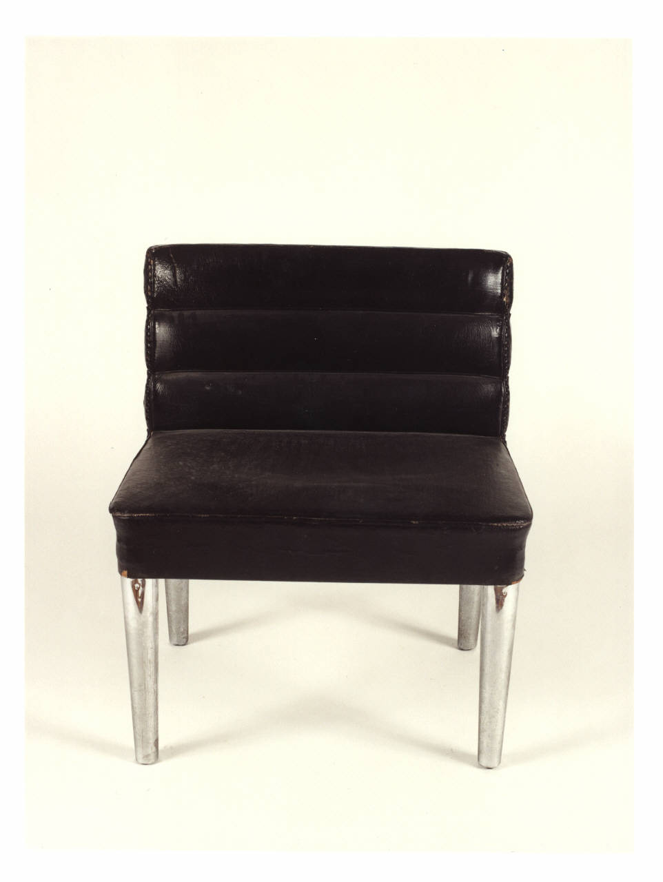 Sedia da toeletta in pelle nera e gambe in acciaio.