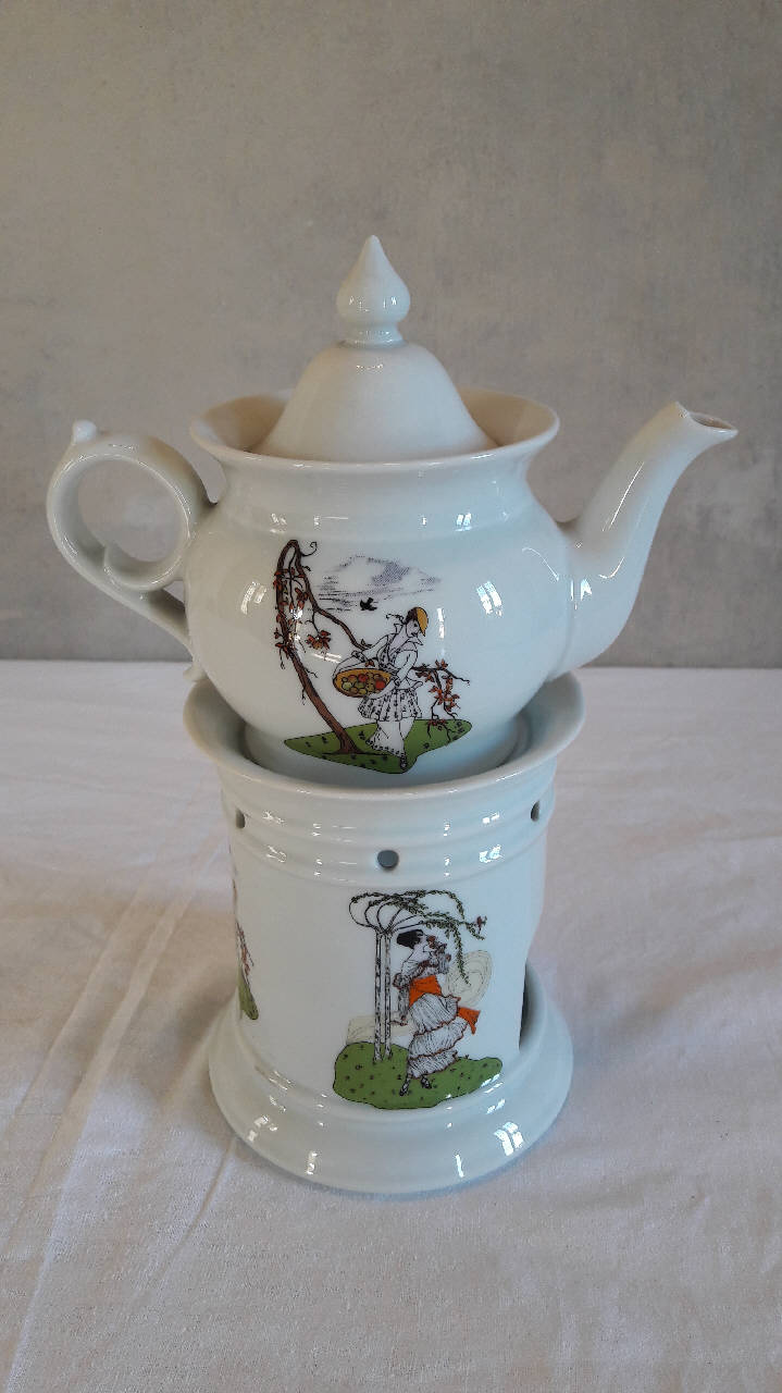 Veilleuse composta da quattro parti: fusto a sezione circolare con fori per areazione nella parte superiore, apertura per il godet nella parte inferiore, orlo inferiore e superiore espanso; godet all'interno del fusto; teiera di forma panciuta con invaso, orlo superiore espanso, manico ad anello con bitorzolo, beccuccio con terminazione allungata; coperchio con presa a punta. A fondo bianco, l'apparato decorativo reso con la tecnica della decalcomania, presenta delle figure femminili in abiti dèco ed elementi ve\ngetali. Di fattura novecentesca che riprende i modelli dell'800.