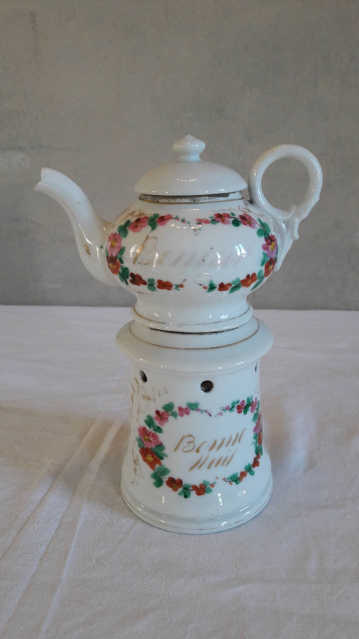 La veilleuse si compone di quattro elementi: fusto con orlo svasato, apertura inferiore per il godet, fori per areazione nella parte superiore; godet all'interno del fusto; teiera di forma panciuta con orlo espanso e manico ad anello, beccuccio mosso; coperchio con presa a pomolo. Gli orli del fusto e della teiera, il beccuccio sono profilati in oro. A fondo bianco, presenta due scritte dorate all'interno di cornici mosse rese con fiori multicolore e foglie verdi dipinti a mano; motivi decorativi vegetali dipinti in oro e grandi fiori azzurri sempre dipinti a mano.