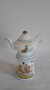 La veilleuse si compone di tre elementi: fusto a sezione circolare, foro per il godet nella parte inferiore, fori per l'areazione nella parte superiore, orlo svasato; teiera dalla forma panciuta con manico ad anello, beccuccio mosso; coperchio con presa a pomolo. A fondo bianco, presenta una decorazione eseguita a mano data da una amazzone e cavalli lungo il fusto; motivi decorativi floreali sul corpo della teiera. Profilature azzurre per gli orli, il beccuccio e il manico; pomolo dorato.