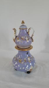 La veilleuse si compone di quattro elementi: fusto a bulbo decorato a rilievi vegetali in corrispondenza dell'innesto dei tre piedini a voluta dipinti in nero, apertura per il godet che si trova all'interno del fusto, fori circolari superiori per areazione, orlo superiore espanso; teiera piriforme con becco e manico decorati pure a rilievo e dipinti in oro con motivi decorativi; coperchio a cupola con presa a pigna. Rilevazioni ed orli sono sottolineati in oro; sul fondo color azzurro del fusto e della teiera si dirama la decorazione con motivi floreali dipinti a mano in oro e bianco con profilature in blu.