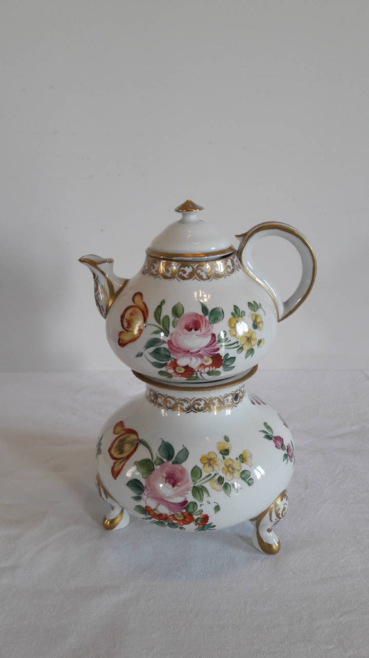 La veilleuse si compone di tre elementi: fusto a bulbo poggiante su quattro piedini a voluta decorati con motivi vegetali e profilature in oro, apertura per il godet nella parte inferiore, fori circolari superiori per areazione, orlo superiore espanso; teiera dalla forma panciuta con manico ad orecchio e corto beccuccio mosso, coperchio a cupola con presa a punta. A fondo bianco, presenta un apparato decorativo dato da fiori multicolore e multi varietà, motivi decorativi a girali vegetali in oro, profilature dor\nate per i diversi orli. Di fattura novecentesca che richiama modelli dell'800.