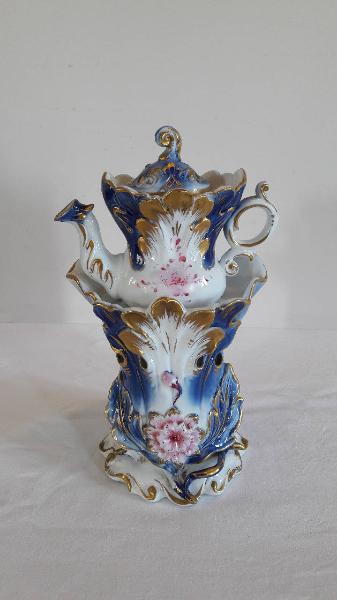 Veilleuse composta da quattro elementi: fusto rastremato verso il basso, con base circolare e corpo di forma ovale, apertura inferiore per il godet, fori per areazione, bordo superiore molto elaborato; godet posto all'interno del fusto; teiera rastremata verso il basso con invaso, orlo superiore molto elaborato, manico circolare con terminazione inferiore a riccio, beccuccio lievemente mosso; coperchio con presa a voluta. Il fusto e la teiera nella parte anteriore e posteriore sono decorati a rilievo: motivi di foglie di colore blu e un fiore rosa centrale in basso nella parte anteriore, motivi di foglie di colore blu nella parte posteriore per quanto riguarda il fusto. Dorature rifiniscono il disegno. Fiore rosa dipinto a mano sul corpo della teiera, sia sul lato anteriore che quello posteriore. Profilature dorate per gli orli dei singoli componenti della veilleuse.