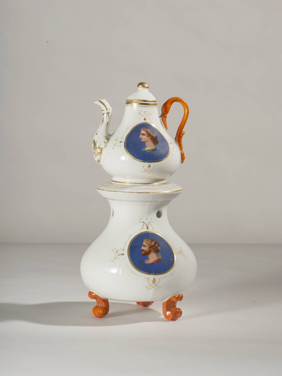 La veilleuse si compone di tre elementi: fusto a bulbo poggiante su tre piedini a voluta dipinti in arancione, apertura per il godet, fori circolari superiori per areazione, orlo superiore espanso; teiera piriforme con becco e manico decorati a rilievo. Il manico è dipinto in arancione, motivi \ndecorativi vegetali in oro sul beccuccio; coperchio a cupola con presa sferica. Rilevazioni ed orli sono sottolineati in oro. A fondo bianco, reca sul corpo del fusto e della teiera quattro ritratti di profilo, maschile e femminile, con corona d'alloro attorno al capo, entro medaglioni blu profilati in oro e circondati da motivi decorativi dorati.