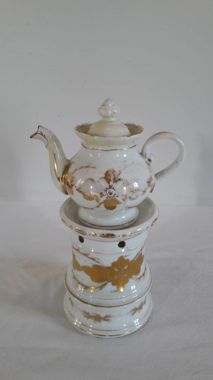 La veilleuse si compone di quattro elementi: fusto circolare lievemente svasato al fondo con apertura per il godet, fori di areazione in alto, orlo superiore sporgente; godet all'interno del fusto; teiera dalla forma panciuta con invaso, manico a orecchio, beccuccio mosso; coperchio con presa a fiore stilizzato. Il manico e il beccuccio della teiera, la presa del coperchio, gli orli del fusto e della teiera sono profilati in oro. Su fondo bianco, presenta una decorazione floreale dorata che si dirama sul fusto e sulla teiera.