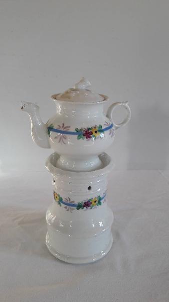 Veilleuse composta da quattro pezzi: fusto a sezione circolare con restringimento nella parte centrale, fori per areazione nella parte superiore, apertura inferiore per il godet, orlo superiore espanso leggermente mosso; godet posto all'interno del fusto; teiera di forma panciuta con invaso, orlo superiore espanso, manico ad anello con bitorzolo, beccuccio mosso; coperchio con foro e presa a forma di frutto con foglioline. A fondo bianco, presenta una decorazione dipinta a mano data da motivi decorativi floreali lungo una linea circolare di colore azzurro. Tracce di doratura lungo gli orli del manico e la parte terminale del beccuccio.