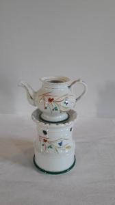La veilleuse si compone di due elementi: fusto circolare lievemente svasato al fondo con apertura per il godet, fori di areazione in alto, orlo superiore sporgente e leggermente mosso; teiera dalla forma panciuta con manico a orecchio con bitorzolo, beccuccio mosso. Gli orli, il manico e il beccuccio della teiera sono profilati in oro; orlo della base del fusto e della teiera dipinto in verde. Su fondo bianco, semplice decorazione floreale multi colore dipinta a mano presente sul fusto e sul corpo della teiera.