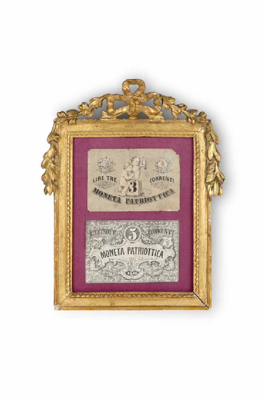 L'insieme è costituito da due quadretti di formato rettangolare, orientat\ni in verticale e dotati di una cornice in legno dorato decorata nella parte superiore da un motivo con ghirlanda e nastri. All'interno dei quadretti sono contenuti quattro esemplari di moneta patriottica del 1848 da 1, 2, 3 e 5 lire.