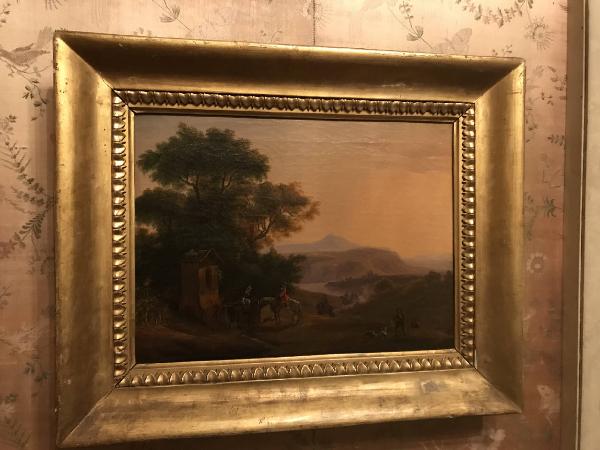 - NOTIZIE STORICO CRITICHE Il dipinto, attribuito a Massimo d¿Azeglio, raffigura un vasto e verdegg\niante paesaggio, circondato da rupi e montagne e attraversato da un drappello di soldati a cavallo. Sulla destra, un personaggio accompagnato da due cani cammina, osservando la scena. Alcuni cavalieri, rappresentati in primo piano in leggera penombra, stanno sostando, mentre altri li stanno raggiungendo con i cavalli in corsa. I colori giallo e rosato del cielo suggeriscono un¿ambientazione della scena al crepuscolo. Nato a Torino nel 179\n8, Massimo d¿Azeglio era figlio di un marchese, appassionato di pittura \ne collezionista. Cresciuto a Firenze, dove frequentò la casa della contes\nsa d¿Albany e conobbe Vittorio Alfieri, dal 1814 soggiornò ripetutament\ne a Roma. Qui incontrò, grazie alle conoscenze del padre, Antonio Canova,\n Bertel Thorvaldsen e Gaspare Landi. Si appassionò alla pittura di paesag\ngio della scuola fiammingo-olandese, nella quale tuttavia aggiunse un elemento di novità: decise infatti di sostituire nei suoi dipinti pastori e b\nestiame con cavalieri, paladini e donzelle. L¿inserimento di episodi e p\nersonaggi storico-letterari nella pittura di paesaggio costituì una vera \ne propria novità per il genere, destinata a riscuotere grande consenso. N\nel 1831 d¿Azeglio si trasferì a Milano, un ambiente che riteneva partic\nolarmente vivace e attrattivo, favorevole alla sperimentazione artistica. Nel capoluogo lombardo entrò in contatto con alcuni tra i più significat\nivi intellettuali milanesi del tempo, tra cui Alessandro Manzoni, che sarebbe diventato suo suocero (d¿Azeglio sposò nel 1831 Giulia, figlia dell\no scrittore). All¿attività pittorica affiancò la letteratura e la poli\ntica: scrisse il romanzo risorgimentale ¿Ettore Fieramosca ossia La disf\nida di Barletta¿ (1833) e dal 1844 si schierò a favore dei moti del ¿\n48. Ritornò alla pittura solo dopo i fallimenti delle guerre di indipende\nnza. Morì a Torino il 15 gennaio 1866.