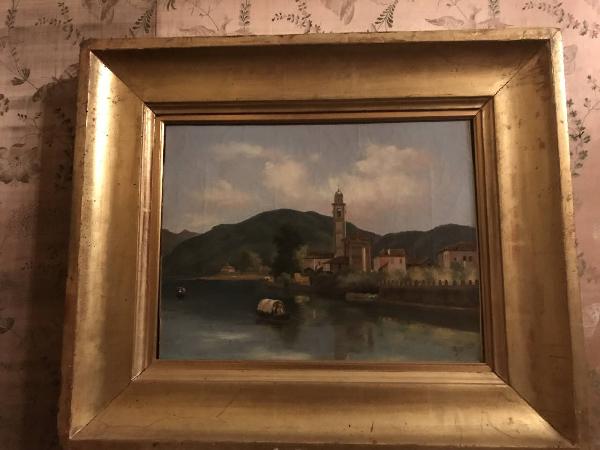 - NOTIZIE STORICO CRITICHE Il dipinto, siglato in basso a destra G.C., è una veduta di lago. Incorni\nciato da rilievi verdeggianti, il bacino lacustre è attraversato da due i\nmbarcazioni: sono due "batèll", antiche barche a remi utilizzate dai pesc\natori del lago di Como. La presenza dei "batèll" e gli edifici raffigurat\ni sulla destra (chiesa, campanile, argine) sono riconducibili al borgo di Cernobbio, uno dei luoghi più celebri del lago di Como. Il dipinto è ope\nra di un pittore lombardo del XIX secolo; la sigla G.C. potrebbe essere apocrifa e fare riferimento al vedutista di fama europea Giuseppe Canella (Verona, 1788 - Firenze, 1847); un¿opera con la medesima sigla, raffiguran\nte ¿Il ponte della Vittoria e l¿antica Porta Ticinese¿, è comparsa \nsul mercato antiquario nell¿aprile 2014 (Milano, Il Ponte), ed era stata\n pubblicata nel 1940 con attribuzione non a Giuseppe, ma a Giulio Canella. Sembra non esistere tuttavia nessun Canella pittore chiamato Giulio.